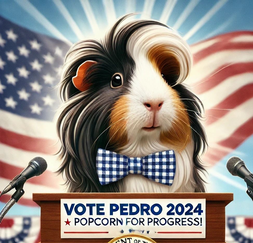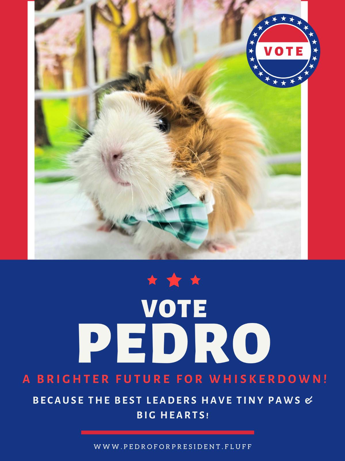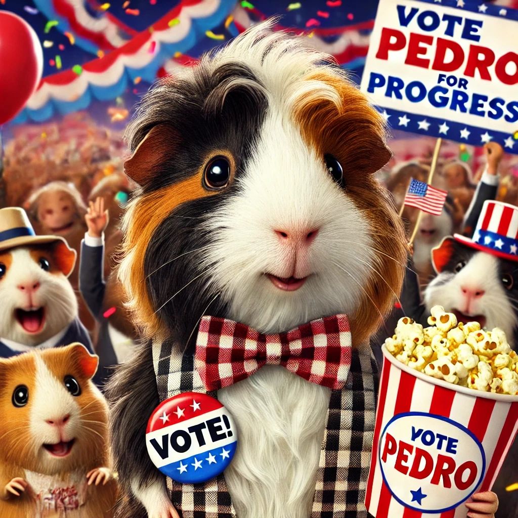 "I don’t know about you guys, but I’ve never met a guinea pig more deserving of the presidency. He’s got sweet skills—like leadership skills, snack management skills, and just overall good vibes. If you don’t vote for Pedro, that’s pretty much the worst decision of your life. I mean, what else are you gonna do? Vote for Sir Squeaksalot? Gross."